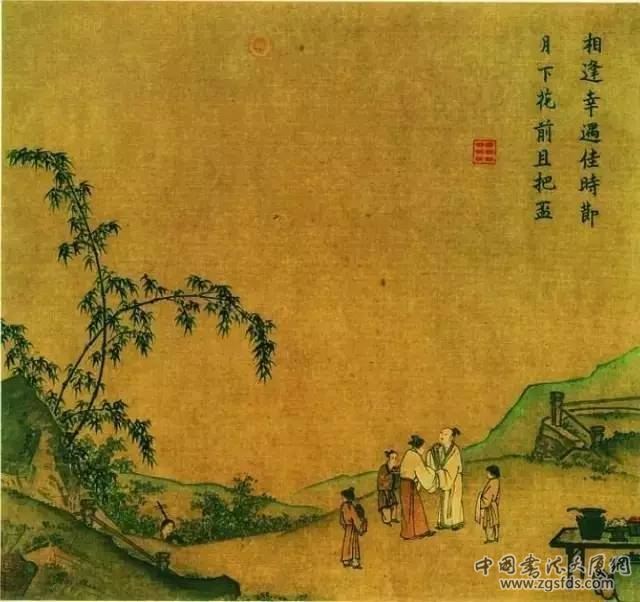 《月下把杯图》所绘的是十五中秋美景之夜,一轮圆月高挂空中,照的天地是那么的明亮。在这“每逢佳节倍思亲”的美景月下,恰逢远方多年不见的好友佳节来访,这让刚刚还在睹物思友的主人家中,立即增添了极大的精神欢乐。有诗句曰:“得好友来如对月,有奇书读胜观花”,似乎正是这个意境。
