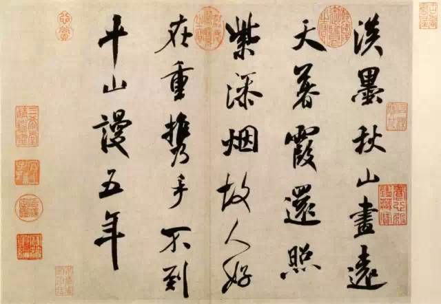 【赏析】此帖运笔如刷,笔力雄健,结态造势宽展肥美,当为米芾中年书法之精品。此帖流传有绪,历代著录于《墨缘汇观》、《石渠宝笈续编》,刻入《三希堂法帖》。藏于北京故宫博物院。释文:淡墨秋山画远天,暮霞还照紫添烟。故人好在重携手,不到平山谩五年。
