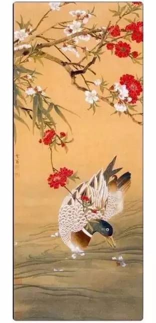 【赏析】《春江永暖》画中点点桃花,红白相间,前后相映,几枝摇曳的绿竹,穿插其中,更显出桃花的娇艳。一只色彩斑斓的花鸭,悠然自得的嬉戏在流水中.追逐着飘落的花瓣,一派生气盎然的景象。此幅作品用独特的艺术语言充分地表达了”春江水暖鸭先知”这句脍炙人口诗句的意境。
