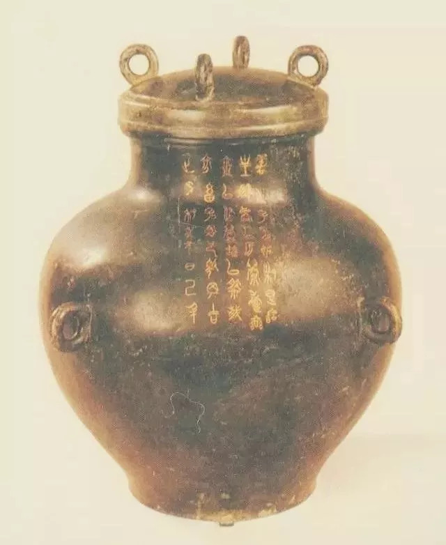 栾书缶,是栾书祭祀祖先时盛酒的用器,高48.8厘米、口径16.5厘米。器身及盖各有四环纽,纽作斜角云纹。自颈、肩及於上腹有错金铭文五行四十字,盖内铸铭两行十字,由左而右,字皆嵌金,为栾书子孙祭祀祖先而作,但多年来习称栾书缶。