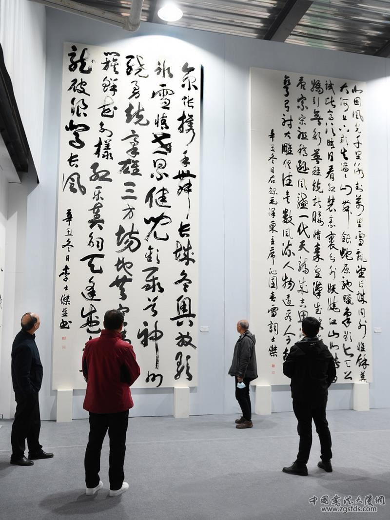 左侧便是李士杰先生创作的书法巨幅作品《自作冬奥诗》和《毛泽东—沁园春·雪》词,两幅作品均高6米,宽3米。整幅作品笔墨厚重,拙朴雄浑,从心所书,浑然天成。另有四幅不同创意书法作品也彰显鲜明艺术特色。