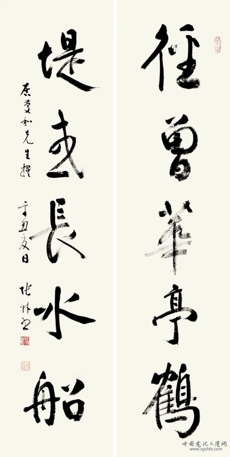 张财的书法以静为骨,以韵生情。以古为法,远离时风。线条干练蕴藉,古意频出。如撇的下发力、线条的等粗行进、暗折的注入等等,无不渗透着魏晋古法的遗韵,可谓深谙其理,如其草书直幅《孟浩然诗》就是一例。线条的古意还体现在线质上,其以篆籀线入书,辅以苍茫线和轻松线,在洋洋洒洒的挥运中相互融合,古意盎然,如其草书直幅《柳宗元诗》,开笔就是篆籀笔法,浑厚沉实,“重若崩云”,奠定了通篇作品的基调。