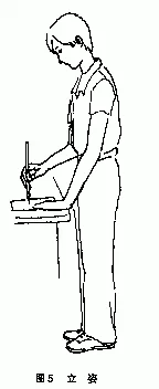 指身体向前略作弯曲,与手臂的趋势相协调。如身体过于挺直,就会阻碍运笔书写。