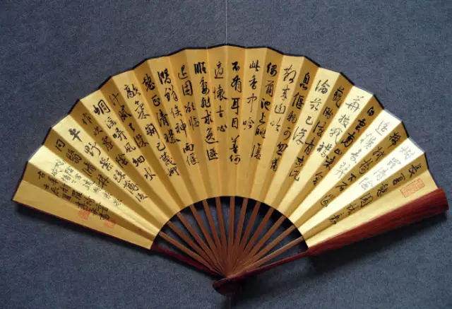 扇面的书写,尤其上骨的扇面书写,因高低不平,行笔难度很大,因此欲书写的字数不适宜太少。所以,扇面书法创作时一般应选择较多字数的书写内容,以在有限的空间内充分展现创作水平。如果字数过少,会给人单薄、单调之感。字数也并非越多越好,并非越满越好,要根据书体及形式,把握好一个“度”。总的原则是,多而不“堵”,少而不“空”。另,书写多字数时,可将扇面尽量展平,左、右、上需用镇纸压住,将字写在扇骨之间的空白处。裱好的扇面,因宣纸的效果失去一半,所以书写时不宜多蘸墨。