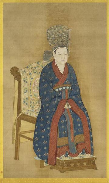 《宋仁宗后坐像》则与其他帝后像不同,画中除了有仁宗皇后,还有两位宫女分立两旁。