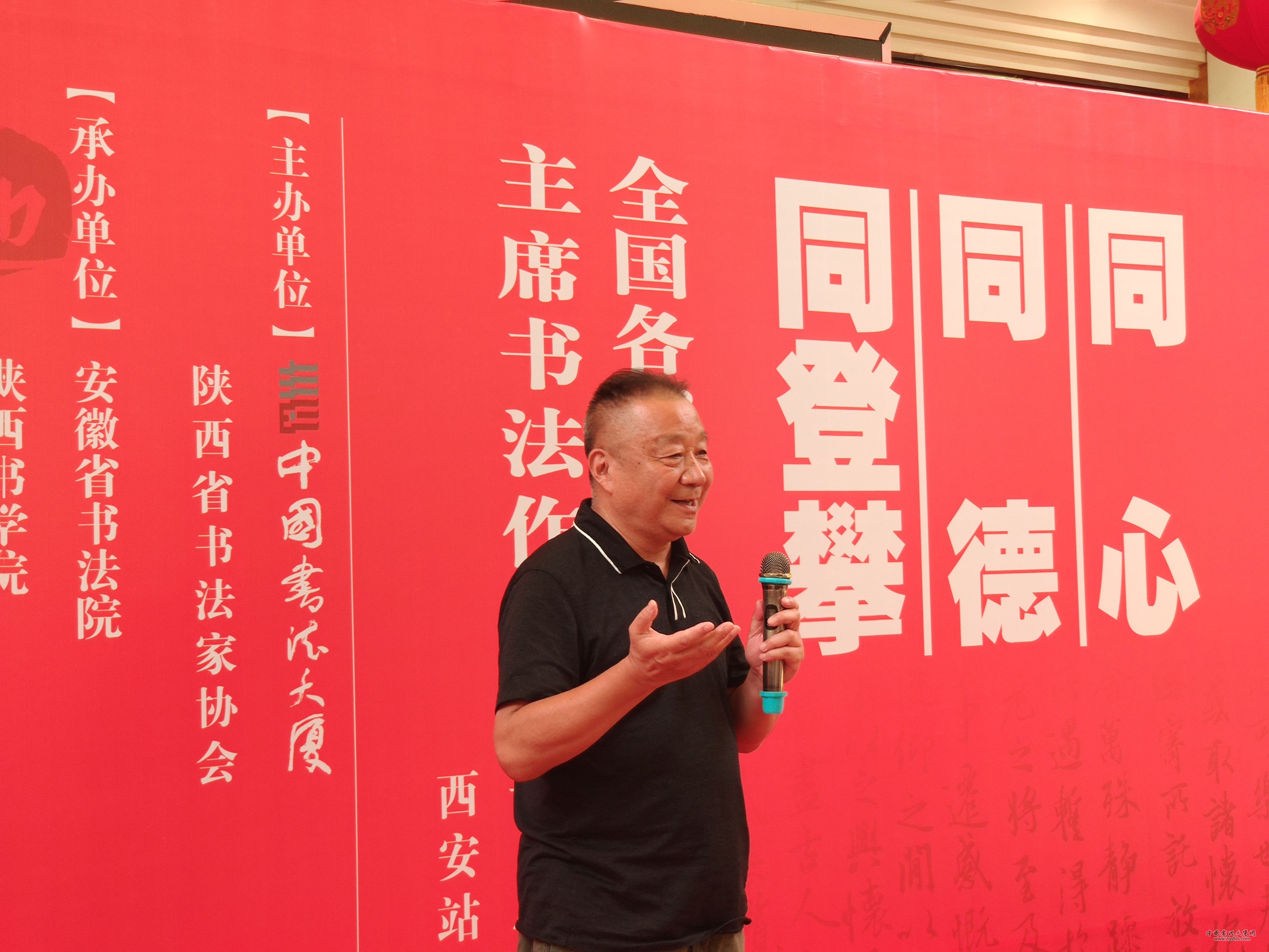 安徽书法院院长李士杰在致辞中表示,此次西安展览是全国巡展的第九站。巡展旨在落实习近平总书记在文艺工作座谈会和中国文联第十次全国代表大会上的重要讲话精神,以“同心·同德·同登攀”为主题,是一种敢于担当、强化社会责任意识和奉献意识的文化自觉和文化自信。同心,就是加强团结交流,为人民书写,为人民抒怀;同德,就是树立以人民为中心的创作导向,努力做到德艺双馨;同登攀,就是继承和发扬中华优秀传统文化,不断攀登文艺新高峰。