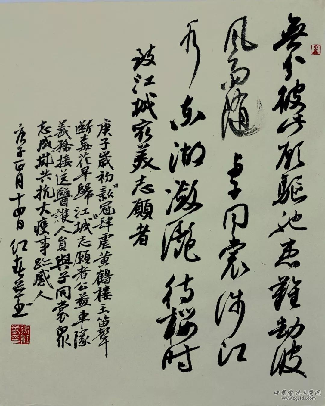 致江城最美志愿者。庚子岁初,“新冠”肆虐黄鹤楼,玉笛声断,梅花早归。江城志愿者公益车队义务接送医护人员,与子同裳,众志成城,共抗大疫,事迹感人。庚子正月十四日,红春并书。