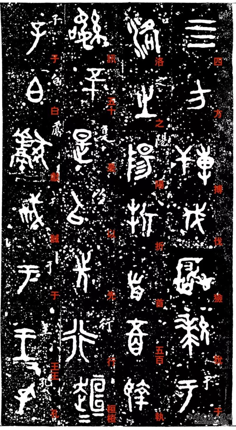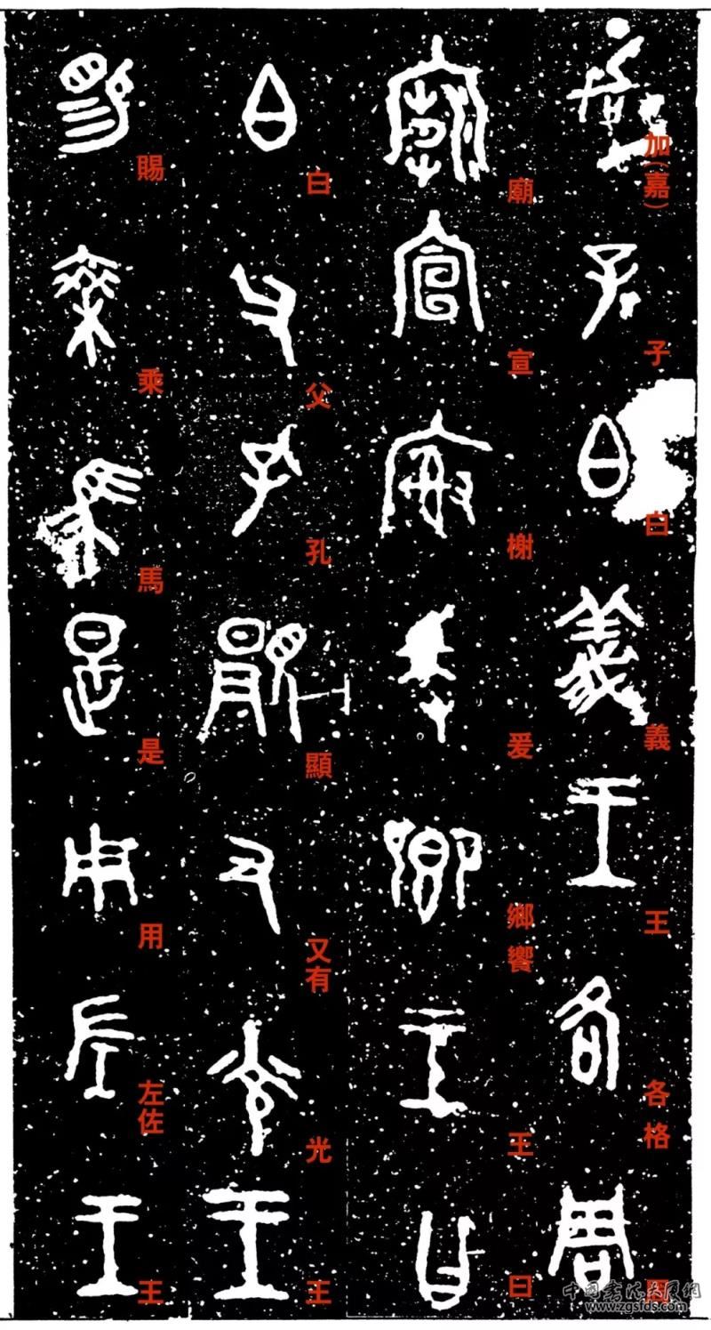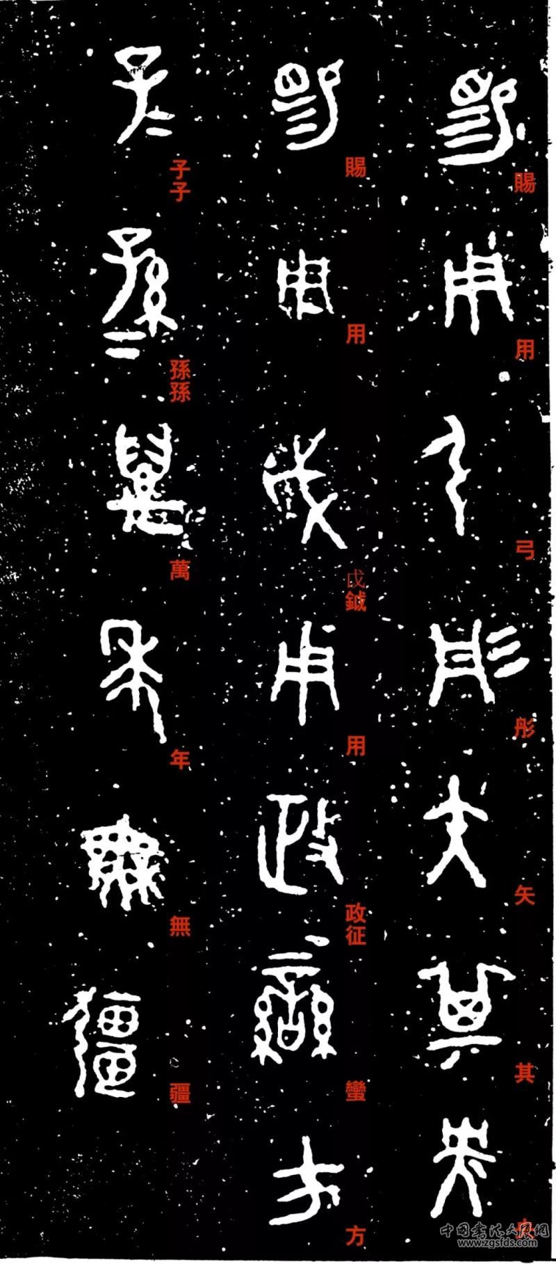 释文:佳(唯)十又二年正月初吉丁亥,虢季子白乍(作)宝盘。不(丕)显子白,壮武于戎工,经维四方。搏伐玁狁,于洛之阳。折首五百,执讯五十,是以先行。桓桓子白,献馘于王。王孔加子白义(仪)。王各(格)周庙宣榭,爰乡(飨)。王曰:“白父,孔显又(有)光。”王赐乘马,是用左(佐)王;赐用弓,彤矢其央;赐用戉(钺),用政(征)蛮方。子子孙孙,万年无疆。