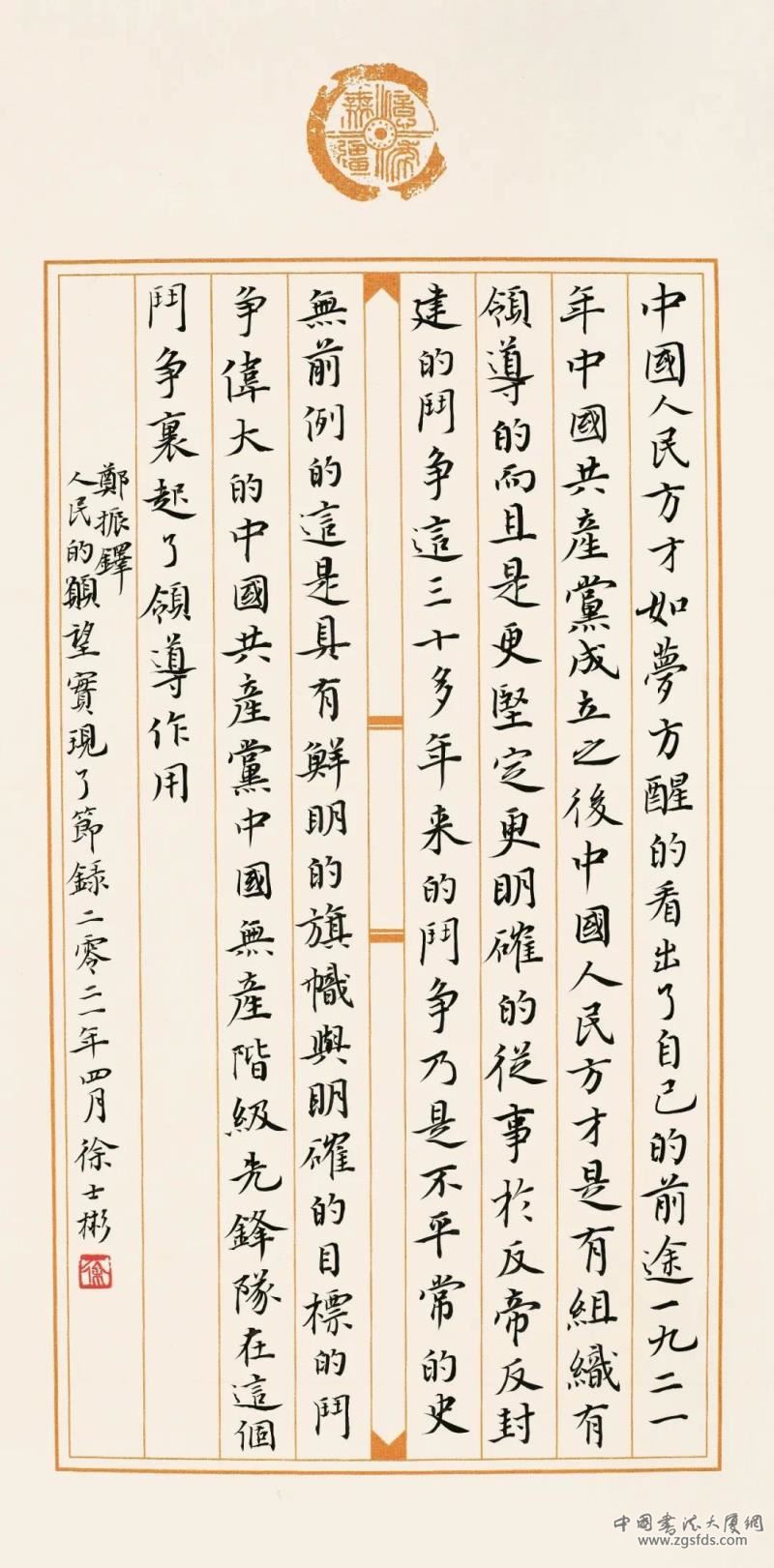 本次书法大展分为百年辉煌、崇高信仰、光昭九域、地方系列展四个篇章,以时代重大主题为核心,通过书法展览的叙事手法,纪实展现中国共产党领导中国人民进行伟大实践的奋斗历程。充分发挥新时代书法记言录史的功能,运用宏观全景叙事、微观人文表达的策展手法,采用浸入式感受、体验式书写、主题性创作的策展理念,构建以主题思想表达为中心的集体创作模式。广大书家以党史感悟初心,以笔墨渲染时代,于守正出新中饱蘸浓墨书写精彩壮美的时代华章。功用与艺术齐驱,文章与翰墨相映!
