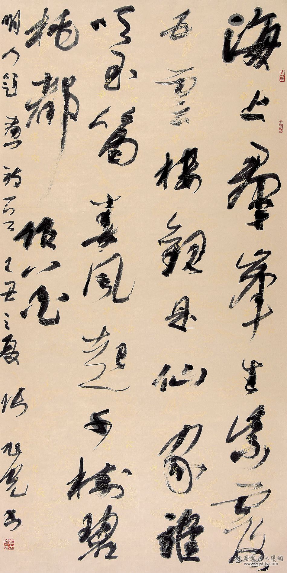 张旭光是1955年出生,小学,中学,基本在“文革”中度过,“史无前例”的虚度!纵然同龄者中有一千个牛顿、一千个爱因斯坦,也只能沦为“造反有理”的打手,和“知识越多越反动”的牺牲。唯有书法特别,由于伟人的倡导和“大字报”的助推,反而空前普及,蔚为繁荣。张旭光正是凭着书法的爱好,得以在文化荒漠中守住一眼清泉。而后参军入伍,他的文化与书法得到长足的发展。九十年代初转业进中国书协,数年后去中国文联,又数年,重回中国书协,一路做到副秘书长,堪称如鱼得水,如鸟飞天。书坛曾有“张旭光现象”、“张旭光时代”之说,可见春风得意,很领了一番风骚。这几年工作调动,移位中国美协,仍任副秘书长。一般人看来,似乎荒腔走板,用非所长;我不这么看,对于艺术家,每一种经历都是财富,都会有意想不到的功效——当然,这就要看本人的禀赋了。艺术绝对需要天才,而天才最忌一马平川、一帆风顺,换一种岗位,也等于换一种人生,无疑于经风雨,见世面,增阅历,开眼界,何况书画同源,隔行不隔山,成天和美术家交道,日日猎美,时时惊艳,人生有此大机缘,真好!真正好!