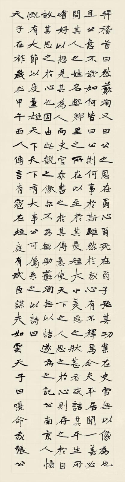 当代的楷书艺术,已经彻底区别于那种状如算子的写字书写,不是每个点画都要用十分的技术去表现才叫楷书。楷书的点画书写表现同样是有详略、有动静、有快慢,楷书字的结构组合同样是有主次、有正斜、有张弛,部首间相互照应变化,章法上也有整体的虚实动态。书写中不应片面追求点画的刀刻味和雕刻感,描头画足,以致板滞。更不应为追求点画的斑驳而边写边抖,矫揉造作。楷书应该是一个富有鲜活的生命力的书法形态,而非一个僵化的书写模式,创作中往往因偶然间的随机生发拓展了作品意境而妙不可言。在楷书创作中,线条的枯湿迟涩转换,点画间微妙的呼应,线与线排列错动,字形的斜正对比、大小参差,章法的整体动态变化,都是楷书赖以传情达意的基本语汇。透过楷书中那平衡和非平衡交织,和谐与非和谐互渗,以及点画与点画,字形与字形,行与行书写排列的冲突复统一,欣赏者自可领悟到一种静穆的风神,进而穿越笔墨透视那澹定清旷的精神世界。
